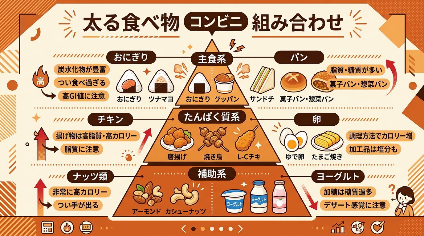 コンビニで太るには、ダイエット向け商品を避けて増量向きの組み合わせを固定することが基本です。ナッツ・ツナマヨおにぎり・チーズ・サラダチキンを3層で組み合わせると、1食あたりのカロリーとたんぱく質を効率よく確保できます。