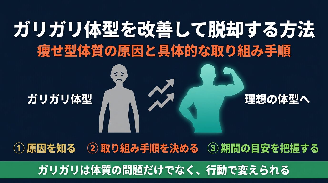 ガリガリ体型の原因と改善手順について解説しました。