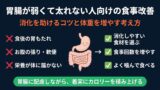 消化・吸収の改善策については、胃腸が弱くて太れない人向けの食事改善と消化を助けるコツで詳しく解説しています。
