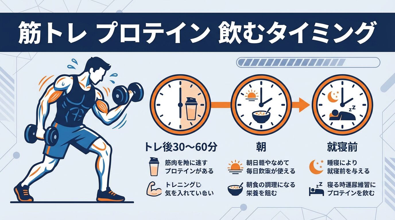 筋トレ プロテイン 飲む タイミング で検索すると、情報が多すぎて迷いやすいです。そこでこの記事では、太りたい男性向けに「どのタイミングから優先するか」を中心に解説します。