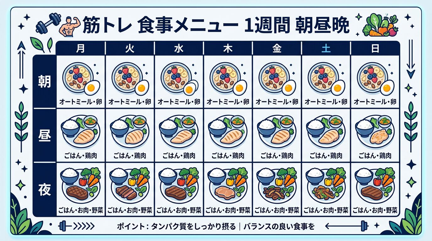 筋トレ 食事メニュー 1週間 朝昼晩 は、毎日完璧を狙うより、週平均で整える方が続きます。朝昼晩を固定化し、補食で不足分を埋める流れを作ると、体重増加の土台が安定しやすいです。