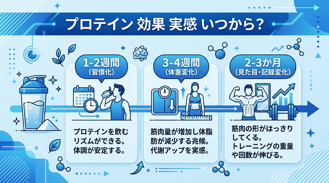 プロテイン 効果 実感 いつから の答えは、1〜2週間で習慣化、3〜4週間で小さな体重変化、2〜3か月で見た目や記録の変化が目安です。重要なのは、期間よりも記録ベースで確認することです。
